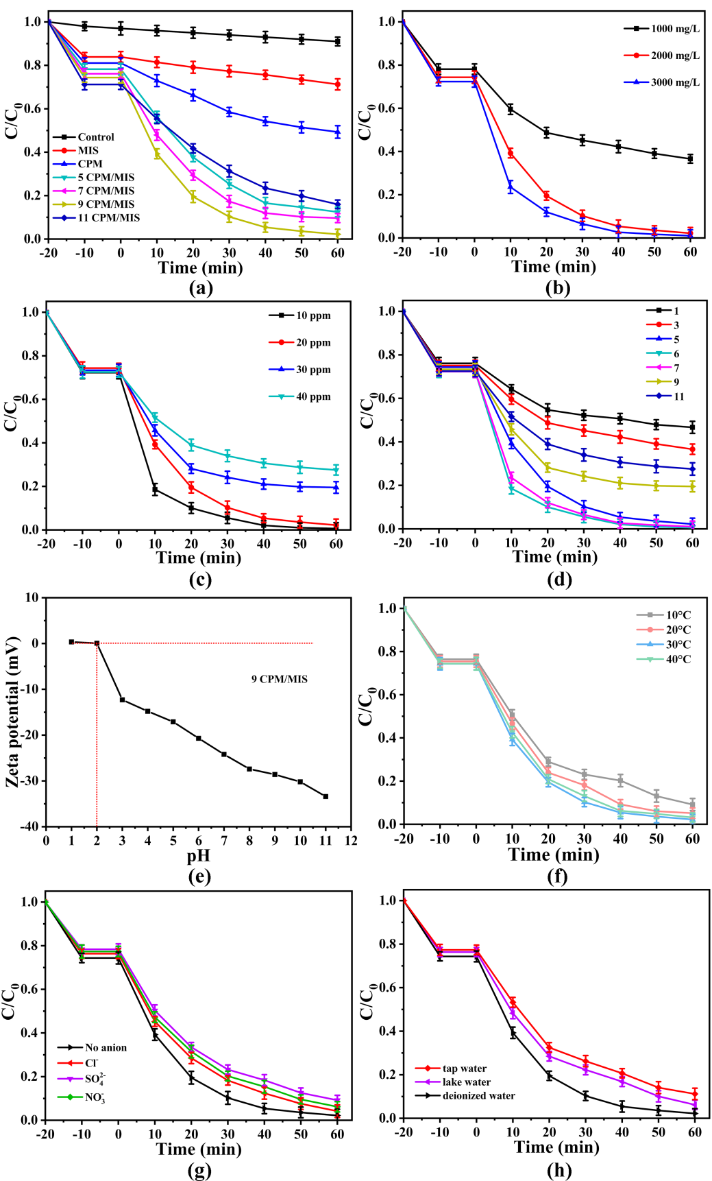 作者將製備的(de)CPM/MIS複合材料應用於光催化(huà)降解TC中。結果表明其(qí)具有良好的可見光催化活性,相比之下,MIS和CPM之間(jiān)形成異質結催化劑,顯著增強了TC降解的(de)催化性能。合成(chéng)的(de)CPM/MIS複合材料在處(chù)理製藥廢水方麵(miàn)具有很大的應用潛力。並考(kǎo)察了汙染物濃(nóng)度、催化(huà)劑用量、pH值、無機陰離子、反應溫度和水質等參數對TC降解效(xiào)率的影響。