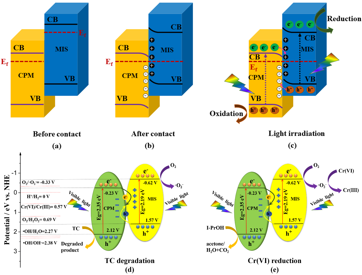 S型異質結中光(guāng)生(shēng)電子和空穴(xué)的(de)分離和轉移機製。與MIS相比,接觸前(qián)CPM表(biǎo)現出(chū)較低的導帶(CB)、價帶(VB)和平衡費米(Ef)位置。當它們開(kāi)始接觸時,電子表現出自發(fā)的從(cóng)MIS向CPM遷移的趨勢,直(zhí)到它(tā)們的費米能級達到平衡,由於電荷重排導致能帶彎曲。在光照下,CPM和MIS都(dōu)可(kě)以被光激發,產生電子並傳(chuán)輸到CB,同時在VB上留下空穴。由於能帶彎曲和內界電場的協同作(zuò)用,MIS的VB上的空(kōng)穴傾向於與(yǔ)CPM的CB上的電子重新結合,從而加速了催化劑體係中光致載流子的分離和轉移速率。