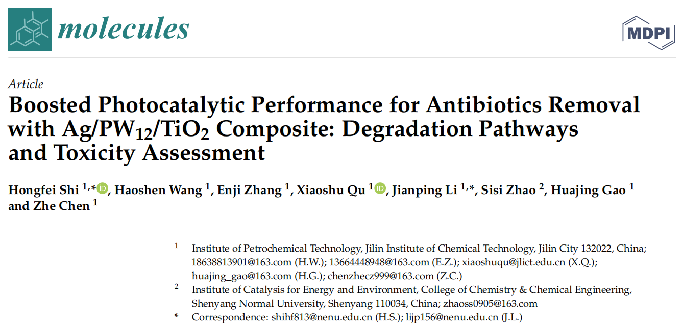 中文標題: Ag/PW12/TiO2複合材料(liào)用於高效降解去除抗生素性能:降解途徑和毒性評估
