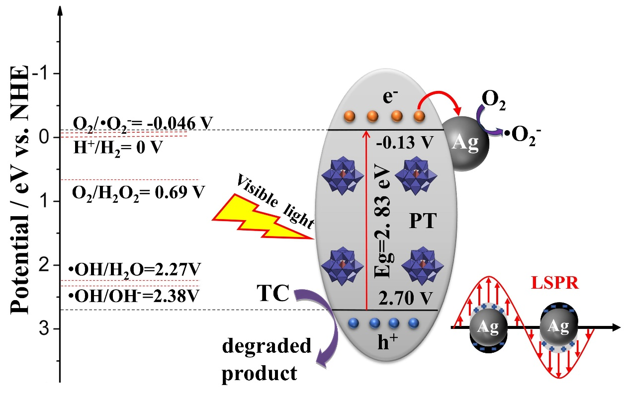 在可見光照射下,PT被光激發以產生電子和空穴。同時,由於Ag NPs的表麵等離子共振(SPR)效應,產生了大量(liàng)的熱電子。作為電子陷阱的Ag NPs能夠有效地捕獲(huò)PT的導帶上的光誘導電子,而由Ag0建立的(de)肖特基勢壘則促進了SPR激發(fā)電子的轉移,進一步加速了電荷分離。Ag NPs上的這些電(diàn)子與O2反應,形成·O2-參與氧化反應。此外,PT中的光誘導空穴直接氧化TC,根據ESR測量結果和捕獲實驗的(de)結果。最終,在h+和·O2-活性物種的幫助下,TC得到了(le)有效去除。