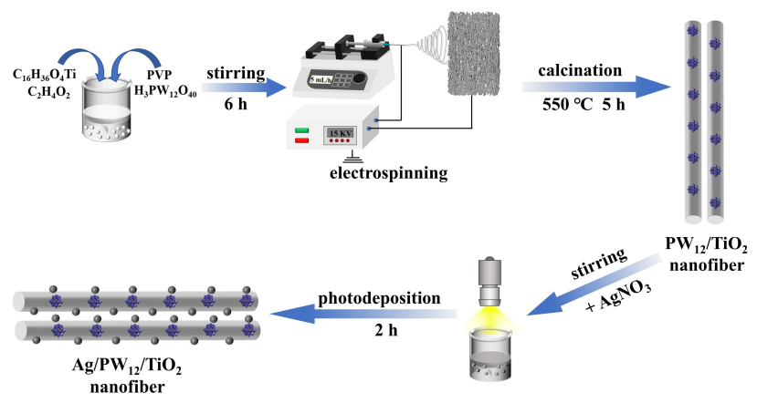 作者采(cǎi)用電紡/光還原方法製備了Ag/PT複合納米纖維。首先,采用電紡絲/焙燒法合成PT納米纖(xiān)維。首先,PVP溶於無水乙(yǐ)醇、乙酸和(hé)鈦丁酸四丁酯的(de)混合物中並攪拌1 h。然(rán)後加入PW12並攪拌直(zhí)至完全溶解。均勻的前體(tǐ)溶(róng)液經靜(jìng)電紡絲操作後經焙燒製備PT納米纖維。其次,采用光還原方法在PT納米纖(xiān)維上修飾Ag納米顆粒。將PT納米纖維(wéi)粉末加入V水: V異丙醇=1:1的溶液中,超聲處理30 min,然後將溶液抽空(kōng),用300 W的氙燈全譜光照射1 h。然後加入AgNO3溶液並攪拌60 min。製備(bèi)了(le)Ag/PT複合材(cái)料。