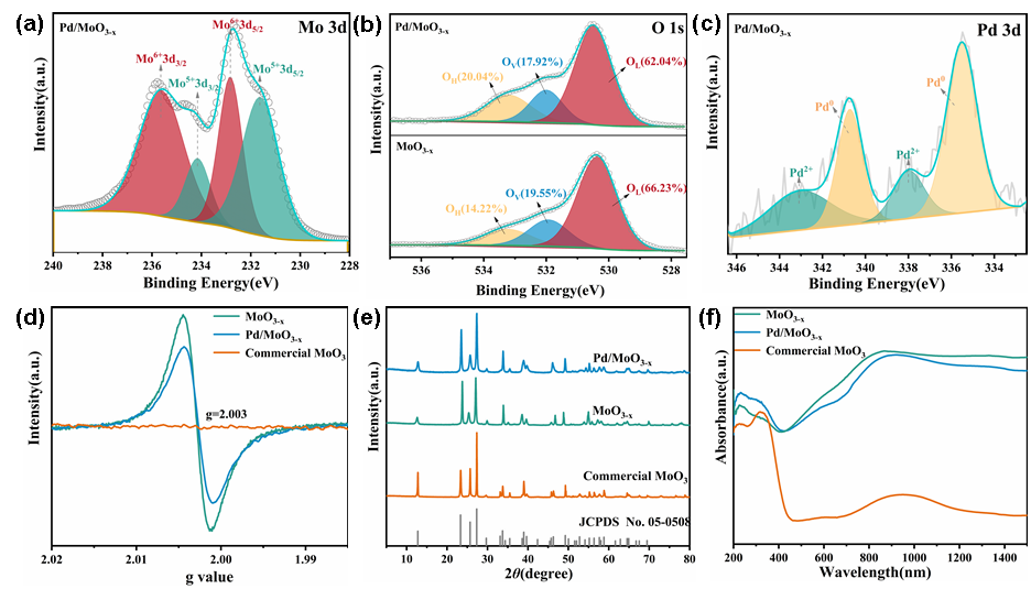 圖2. Mo 3d (a)、O1s (b) 和Pd 3d (c)的Pd/MoO3-x XPS光譜。MoO3-x、Pd/MoO3-x和商業MoO3的EPR光譜(d)和(e)XRD 圖。(f) MoO3-x、Pd/MoO3-x 和(hé)商(shāng)業MoO3的紫外-可見漫反(fǎn)射光譜。