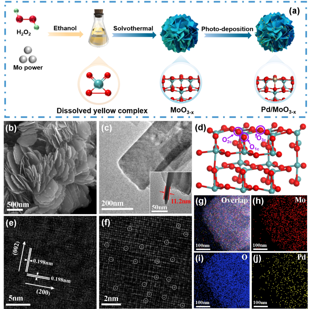 圖 1.催化劑(jì)結構表征 (a) Pd/MoO3-x光催化劑的製備示意圖(tú)。(b) Pd/MoO3-x的SEM和(c) TEM圖像。(d) MoO3結構的側視圖顯示了末端氧空位(O1c)、2配位O位點(O2c)和3配位O位點(O3c)的位置。HAADF-STEM 圖像(e)顯示了 Pd/MoO3-x 的暴露(lù)麵。Pd/MoO3-x 的HAADF-STEM 圖像(xiàng)(f),白色圓圈突出(chū)顯示了原子分散的鈀原子。HAADF-STEM對應(yīng)的EDS能(néng)譜(g-j)顯示了 Mo、O 和 Pd 的元素分布。