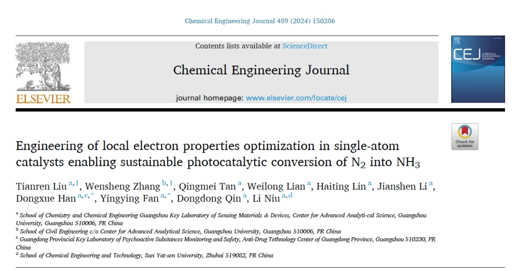 相關研究成果以“Engineering of local electron properties optimization in single-atom catalysts enabling sustainable photocatalytic conversion of N2 into NH3”為題在《Chemical Engineering Journal》期刊(kān)上發表。韓冬雪教授,範英英副教授為該論(lùn)文(wén)的通訊作者,碩士研究(jiū)生劉(liú)天任(rèn)和博士研究生(shēng)張文生為該論文的共同第一作者(zhě)。