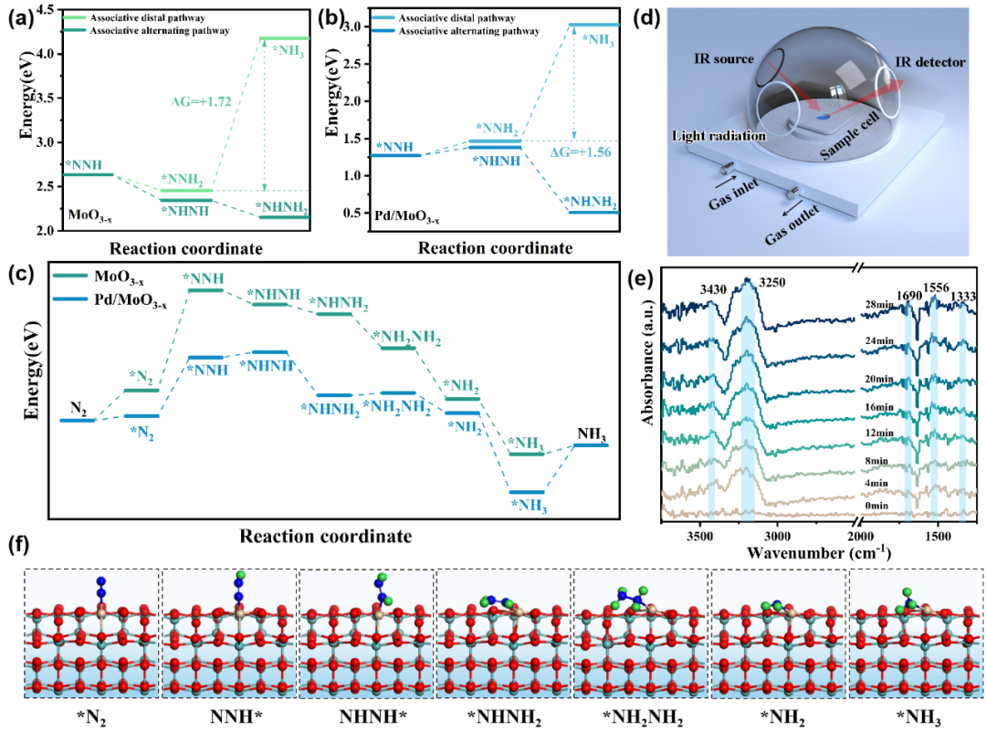 圖5. (a) MoO3-x和(b) Pd/MoO3-x通過遠(yuǎn)端締合途徑和交替締合途徑進(jìn)行 pNRR 過程的部分吉布(bù)斯自由能圖。(c) MoO3-x和 Pd/MoO3-x的N2光固化反應能量圖。 (d)原位傅立葉變換紅外裝置圖。(e) Pd/MoO3-x催化劑在光催化N2固定過程(chéng)中記錄的原位傅立葉變換紅外光譜。(f) Pd/MoO3-x上(shàng)的反應過程示意圖。