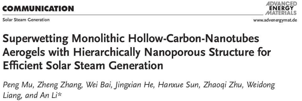 近日,蘭州理工大學石油化工(gōng)學院李(lǐ)安研究團隊,在能源材料領域國際(jì)權威期刊《先進能源材料》(Advanced Energy Materials,最新影響(xiǎng)因子21.875)上在線發表了題(tí)為“Superwetting Monolithic Hollow-Carbon-Nanotubes Aerogels with Hierarchically Nanoporous Structure for Efficient Solar Steam Generation”的全新研究成果。