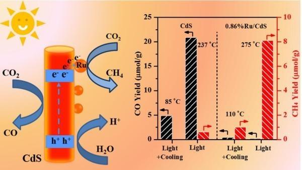 中國科學院城市環境研(yán)究所賈(jiǎ)宏鵬研究團隊通過(guò)簡易的沉積/沉澱法,製備以硫化鎘(CdS)為載體的高分散釕(Ru)單原子(zǐ)催化劑。通過催化劑調控Ru負載量,使其在全光譜照射下展示出較高的甲(jiǎ)烷產物選擇性(97.6%)。Ru單(dān)原(yuán)子的引入並未改變CdS的本質結構,但提高了催化(huà)劑對CO2的吸附量(liàng),促進(jìn)光生電荷的分離(lí)效率,有(yǒu)利於CO2轉化為(wéi)CH4。同時,該催化劑具有(yǒu)較(jiào)好的光熱轉化性能,協同產生的光(guāng)熱效應可有效提高催化性能,且未改變產物選擇(zé)性。該研究為提高太陽光利用率以促進催化活(huó)性提供新策(cè)略(luè)。