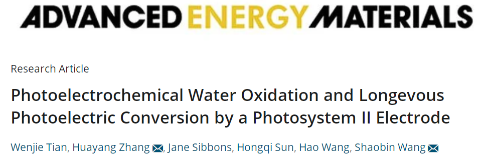 Wenjie Tian, Huayang Zhang,* Jane Sibbons,Hongqi Sun, Hao Wang, and Shaobin Wang*;PhotoelectrochemicalWater Oxidation and Longevous Photoelectric Conversion by a Photosystem IIElectrode;Adv. Energy Mater.,2021;DOI: 10.1002/aenm.202100911.;