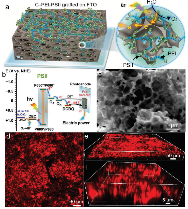 利用生物質熱解生成導(dǎo)電(diàn)性良好多孔碳,負載到FTO導電玻璃表麵,結(jié)合聚乙烯亞胺(PEI)後,成功錨定PSII活性蛋(dàn)白。圖一 展(zhǎn)示了合成示意圖(tú)(a),PSII/PEI/碳 (Ci-PEI-PSII)光(guāng)激發狀態的能級圖(b),以(yǐ)及電極SEM(c)和共聚焦熒光顯微鏡(jìng)照(zhào)片(2D/3D, d-f)。