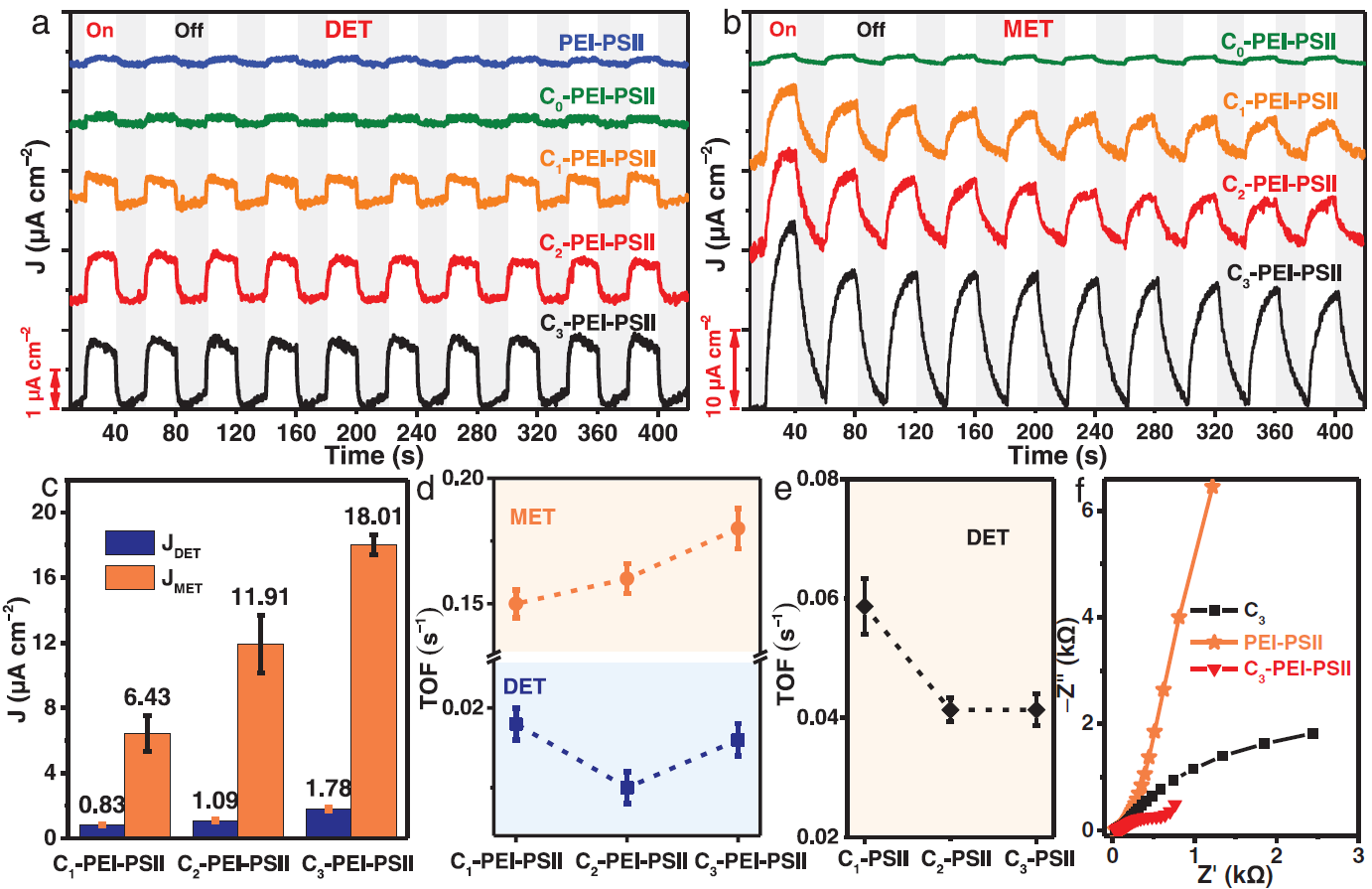 圖(tú)二 展示(shì)Ci-PEI-PSII及(jí)對照(zhào)電極在空氣氛圍,初始開路電位(OCPs)下的直接電子轉移(DET)和調製電子轉移光電響應(yīng) (MET)。