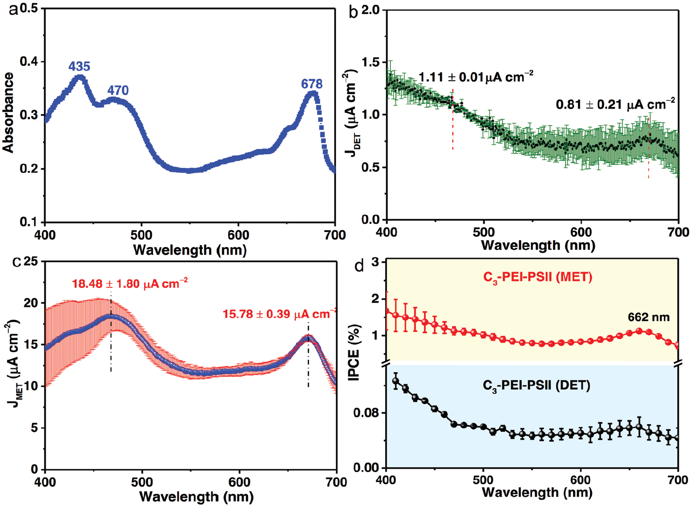 C3-PEI-PSII的UV-Vis光譜 (圖3a) 顯示(shì)PSII在435、470和678 nm處的(de)吸收最大值。在初始OCP條件下,得到C3-PEI-PSII上連續可調光譜單色光照射下的DET和MET電流響應。圖(tú)3b和c所示,JDET(0.81±0.21µA·cm−2)和JMET(15.78±0.39µA·cm−2)的(de)峰值出現在670 nm附近(670 nm處的光強(P670) = 2.67 mW·cm−2),對應於PSII Qy帶的激發JDET峰(1.11±0.01µA·cm−2)和JMET峰(18.48±1.80µA·cm−2)在約470 nm處(P470 =4.30 mW·cm−2)出現,與(yǔ)PSII β-胡蘿卜素的激發相對應。λ≤420 nm處的光電流來自於Bx和(hé)By波段的激發。與UV-Vis光譜相一致(zhì),光陽極典型的光電轉換(huàn)效(xiào)率IPCE最大(dà)值為662 nm (~1.2%), MET條件下的光(guāng)電轉換效率約為DET的17倍。