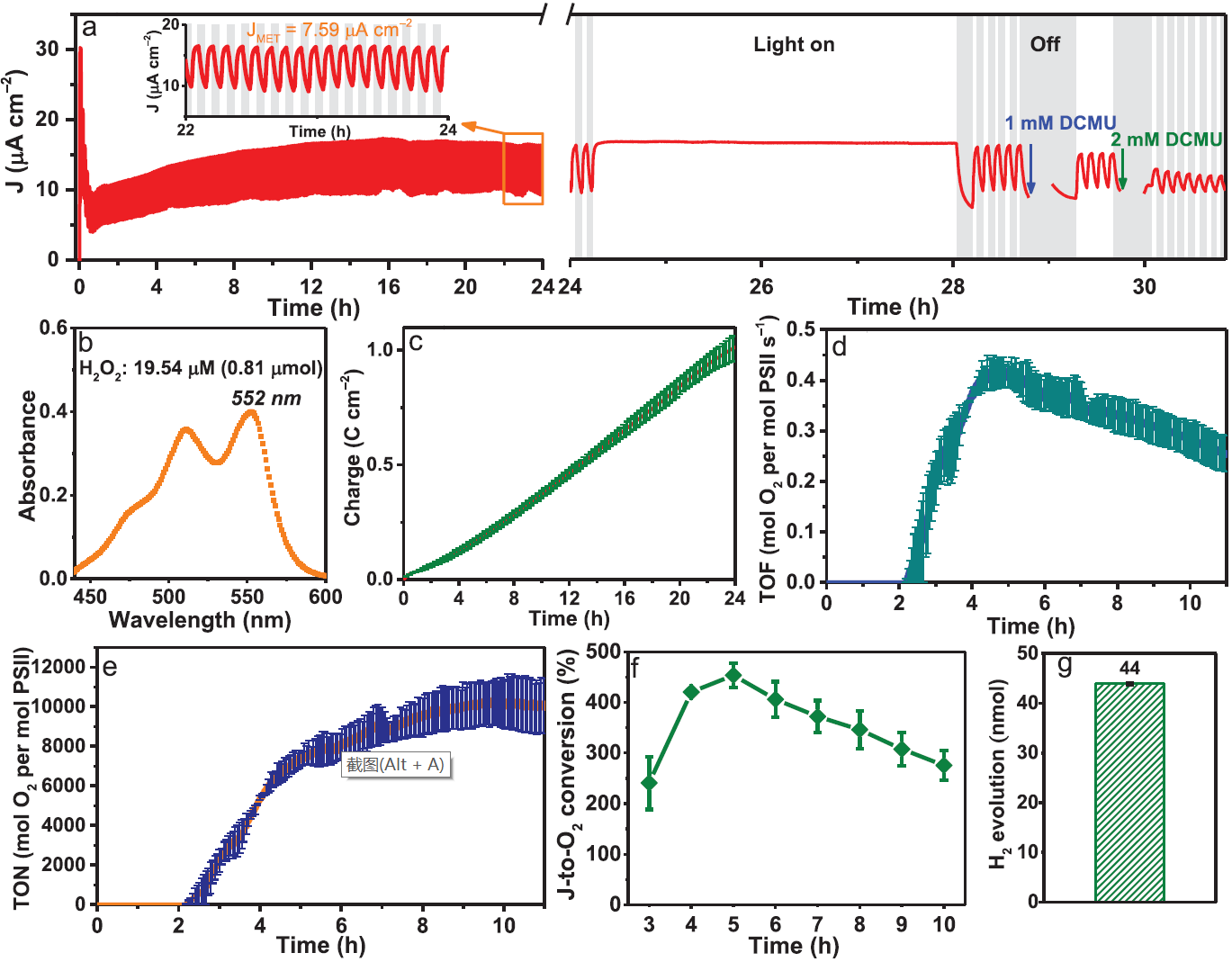 C3-PEI-PSII電極在模擬太陽光照射下,在N2飽和緩衝電解質中的長期性能(néng)監測顯示,JDET在3.5小時內(nèi)衰(shuāi)減約24.6%。經過1 h逐漸(jiàn)下降後,C3-PEI-PSII的JMET在1 - 15 h逐漸上升,經過24 h的光-暗循環後,JMET的產量(liàng)為7.67±0.08µA·cm−2。即使在連續照射(24.2 - 28 h)後,也未觀(guān)察到JMET的下降。C3-PEI和C3-PEI-PSII電極JMET之(zhī)間的巨大差距凸顯了PSII對PEC性能的重要性。將PSII抑製劑DCMU引入C3-PEI-PSII的電解質溶(róng)液(N2氣氛保護)中(圖4a)。DCMU導(dǎo)致PEC反應明顯下降(圖4a),從而證實了(le)JMET源於PSII。然而,DCMU在1 mM和2 mM的引入仍然導致一些剩餘的PEC活性。DCMU對JMET的(de)不完全抑製可能是由於PEC反(fǎn)應中電解質中H2O2的產生(圖(tú)4b),隨著時間的推移(yí),H2O2的電子調製,以及電極交互連接的改(gǎi)善也可(kě)能是JMET在1 ~ 15 h內逐漸增加的原因。