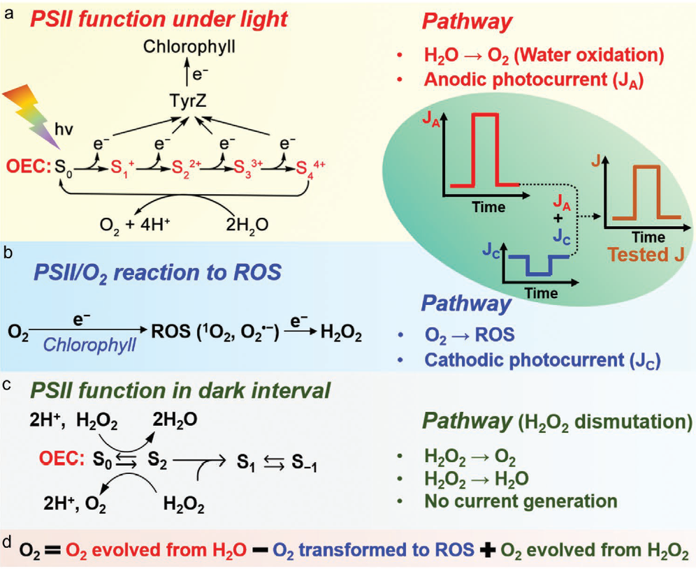 該工作闡(chǎn)明了長期PEC試驗中,PSII在10 h失活前氧氣析出(chū)的(de)機理,以解釋電極上的(de)高法拉第產率和PSII功(gōng)能。PSII功能:光照下PSII的水氧化功(gōng)能;PSII/O2反應生成ROS(雙氧水);PSII在黑暗區間分解H2O2功能, 最終產氧由圖五(d)的公式決(jué)定。