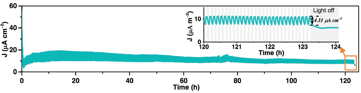 圖六:由C3-PEI-PSII電極在光暗周期(間隔時間為200 s)穩定輸出MET光電流超過5天。灰色(sè)區域為滅(miè)燈狀態。