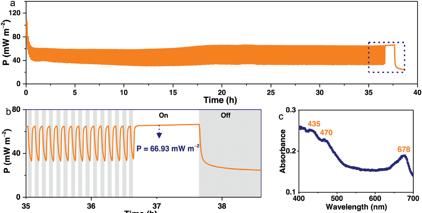 作(zuò)者最後組裝了半人工雙電極體係,該裝置由C3-PEI-PSII光電陽極(jí)連接到由Nafion™117膜分離的Pt陰極組成,在雙室電池中(zhōng)用於長期PEC測試。在這個封閉的設置沒有電解液補充(chōng), 在 36.6 h周期性輻照(zhào),在0.2 V電壓條件下,C3-PEI-PSII電(diàn)極保持穩定的輸出功率(lǜ)66.93 mW·m−2,沒有衰減(jiǎn)跡象(圖七 a、b)。
