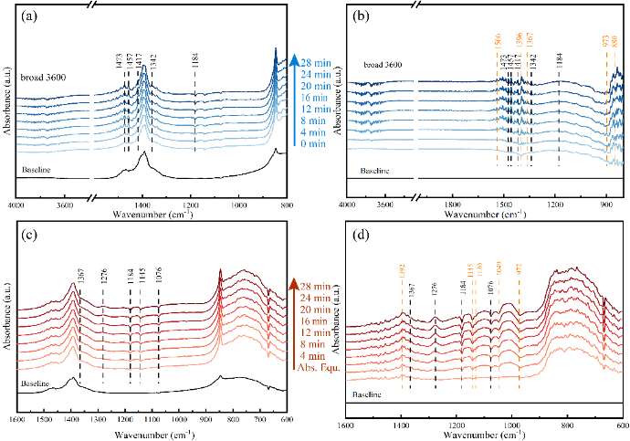 圖(tú) 2 BGO (a),BGS0.1 (b)吸附過程和BGO (c),BGS0.1 (d)光催化NO去除(chú)過程的原位(wèi)DRIFTS圖