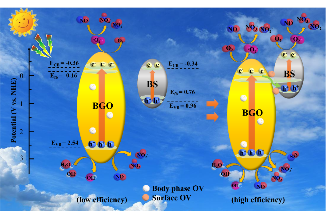 文章簡介: 氮氧化物(wù)(NOx,主要指NO和NO2)是造成酸(suān)雨、臭氧形(xíng)成、光化學煙霧和全球變暖等環境問題的主要原因之一。此外,氮氧化物能夠對人類健(jiàn)康產生各種有害的影響,長期接觸低濃度氮氧化物(wù)會引起慢性咽喉炎、慢性(xìng)支氣管炎等,也會引發不同(tóng)程度的神經衰弱綜(zōng)合症及牙(yá)齒酸蝕(shí)症。由於2019年臭氧濃度明顯(xiǎn)增加(jiā),氮氧化物減排已列入中國“十四五”規劃。 在汽車動力裝置和帶有燃燒(shāo)單元工業裝置產(chǎn)生的NOx中,NO是一種占比很大(dà)的重要成(chéng)分,應該(gāi)通過適當的處理過程來有效消除。由(yóu)於在(zài)溫和條件下,半導體光催化技術可以通過吸收具有適當能量的入射(shè)光,以空氣中的分子氧作(zuò)為氧化劑來完成各種汙染物的去除,特別適合低濃度(ppb)水平NOx的有效去除。在此過程中,NO的氧化易導致具有更強毒性NO2的累(lèi)積,因此需(xū)要設計合成具有良好NO去除和抑製NO2 產生的催化體係。 雖然機械球磨(mó)法可以滿(mǎn)足實驗(yàn)室和工業生產的各種需求,被認為是材(cái)料(liào)加工中最(zuì)經濟、直接、綠色的技術之一,並經常用於固相(xiàng)之間的物理混合和化學改性,但從未用於球磨製備Bi2S3。而(ér)且在球磨過程中,固(gù)-固接觸(chù)界麵可以誘導表麵氧空位(OVs)的(de)產(chǎn)生。 界麵光生載流子和活性(xìng)物種調控和體係的光催化性能密切相(xiàng)關。表麵OVs作(zuò)為吸附(fù)和反應活性位點(diǎn),易於協同異質結構提(tí)高載流子的轉移和分離效率,有效促進活性物種的(de)生成和體係光催化(huà)性能的(de)改善,因此在光催化NO去除領域(yù)頗受關注。為提高軟鉍礦Bi12GeO20的光催化NO去除效率,本(běn)文首次以硫粉為硫源,采(cǎi)用綠色環保的(de)機械球磨技(jì)術製備了Bi12GeO20基複合材(cái)料Bi12GeO20-Bi2S3。經(jīng)分(fèn)析表征,證實形成了具有豐富表麵OVs的n-p異質結構的複(fù)合體係(xì)。 這些複合材(cái)料在可(kě)見光下可有效增強ppb濃度水平NO的(de)光催化去(qù)除,對生成硝酸根和亞硝酸根離子具有較高的選擇性,顯著抑製(zhì)了毒性(xìng)中間(jiān)體NO2的產生。其中,最佳(jiā)的複合樣品BGS0.1具有最高的NO去(qù)除率(lǜ)和最強的硝酸根和亞硝酸(suān)根選擇性(96%),這(zhè)主要與(yǔ)增(zēng)強的可見光吸收、優異的微觀結構和(hé)匹配的能帶結構密切相關。 密度泛(fàn)函理論計(jì)算表明表(biǎo)麵OVs對異質複合體係的能帶結構和反應路(lù)徑具有明(míng)顯影響:表麵OVs能促進NO的吸附,表麵OVs與異質結構一起能促進後續(xù)的氧化(huà)去除過程。基於實驗和分析結果(guǒ),初步推測(cè)這些(xiē)具有良好結構穩定性和可重複利用性(xìng)的n-p異質結構為Z-Scheme複合(hé)體係。本研究為機械球磨(mó)構建具有豐富表麵氧空位的異質結構複合體係進行了有益嚐試,也為軟鉍礦Bi12GeO20的改性及在(zài)可見光光催化(huà)去除NO方麵的(de)研究提供了新的思路(lù)。