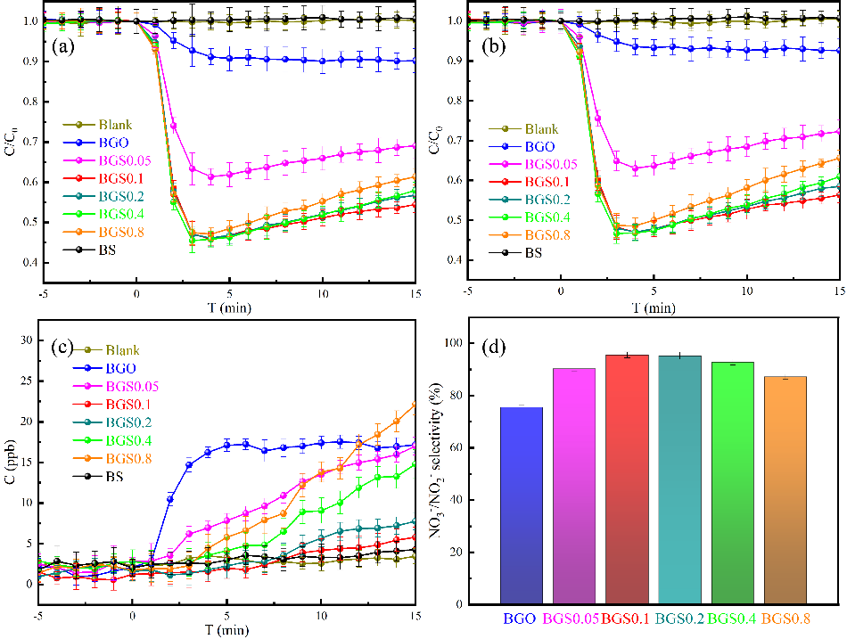 圖 1所製備樣品的NO濃度變化 (a),NOx 濃度變化 (b),NO2產生 (c)及NO2-/NO3-的選擇性(d)