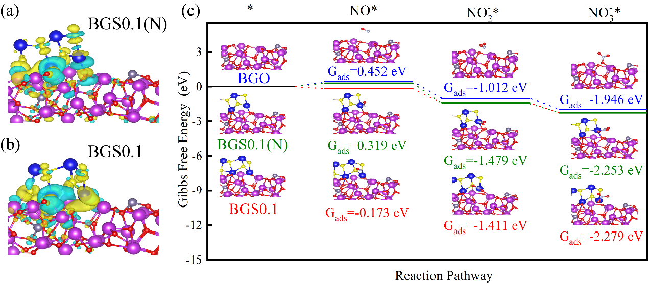 圖 3 BGS0.1(N) (a)和BGS0.1 (b)的變化(huà)密(mì)度分布,BGO, BGS0.1(N), 和(hé)BGS0.1 的吸附和反應活化能的DFT計算變化 (c)