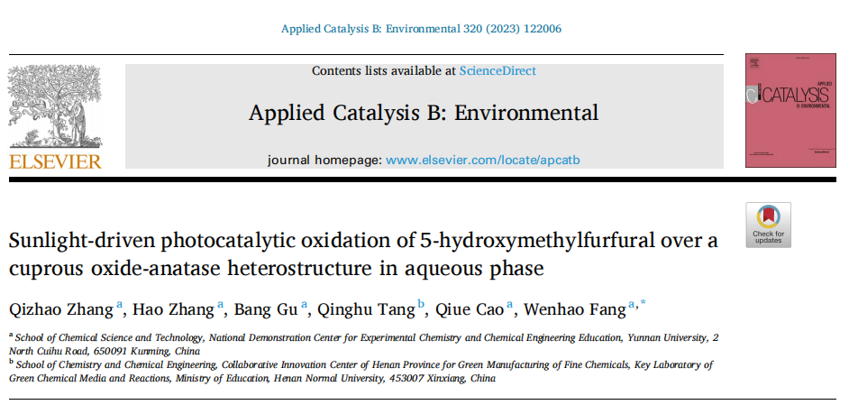 中文標題:水相中氧化亞(yà)銅-銳鈦礦(kuàng)異質結上太陽光驅(qū)動的5-羥(qiǎng)甲基糠醛催化(huà)選擇氧化