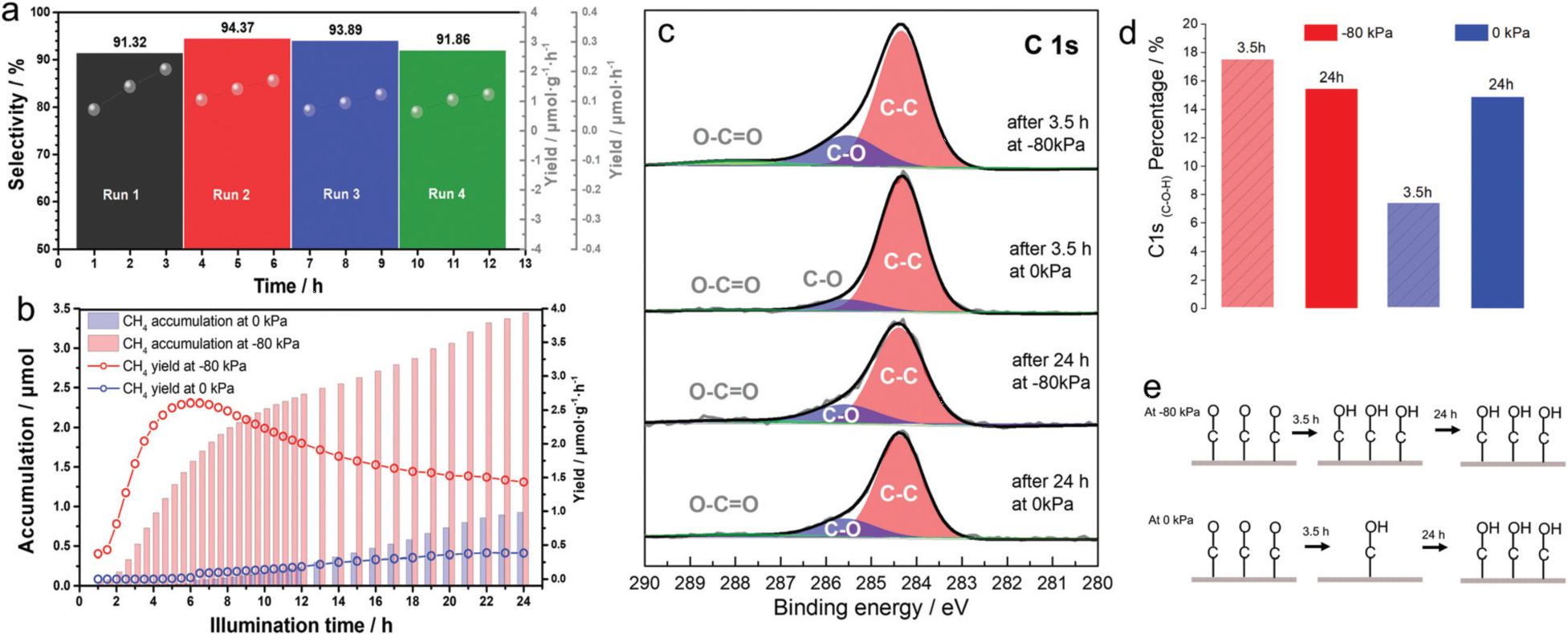 催化反應的穩定性在實際實施中舉足輕重,我們測(cè)試了在(zài)低真空下反應四個循環(圖(tú)2a)和連續反應24小時(圖2b)的情況,實驗表明,CH4產率(lǜ)和選(xuǎn)擇性均穩定。24小時後,CH4產率在低真空下(xià)是3.4umol,在大氣(qì)壓下是(shì)0.9umol.我們用(yòng)XPS分(fèn)析了在不同氣壓(yā)下的催化反應過(guò)程(圖2c-d)。低(dī)真空下,反應3.5小時,催化劑表麵COH*飽和,一(yī)直持續到反應24小(xiǎo)時(shí)(有CH4生成);而在大氣壓下,反應(yīng)3.5小時的COH*很少(shǎo)量,反應24下時催(cuī)化劑表麵(miàn)的(de)COH*才逐漸飽和(如圖(tú)2e)。