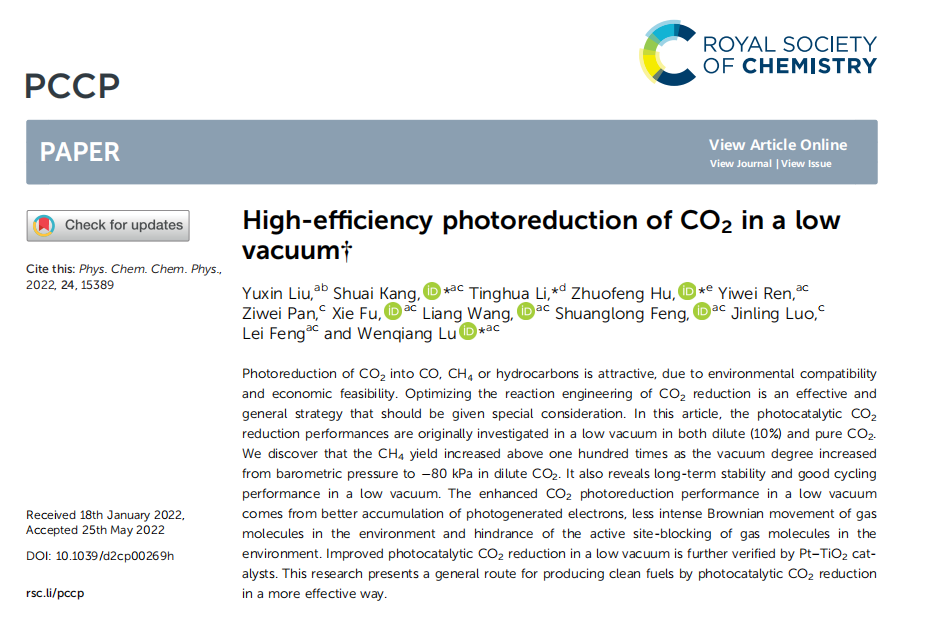 總之,研究表明氣壓對光催化CO2還原反應有很大的影響,低真空下光催化CO2反應性能有所提高。不論在純CO2中還(hái)是在低濃度CO2(10%)中,這個結論依然成立。性能增強主要來源於低真空下光電子能更好的聚集(jí)、布朗運動較弱、有更多(duō)的(de)活性位點。我們認(rèn)為這種從工程學角度來提高光催化CO2的反應效率是有效且普(pǔ)適的策(cè)略,能為光電催(cuī)化CO2還原反(fǎn)應和(hé)其(qí)他反(fǎn)應提供有價值的參(cān)考。