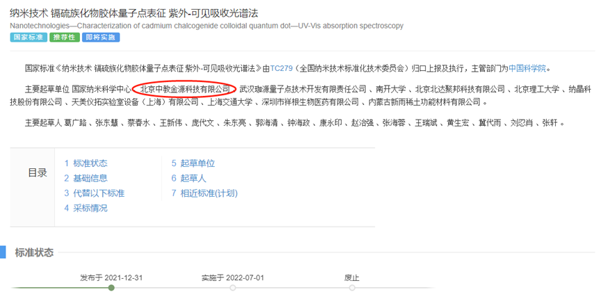國家標準《納米技術 鎘硫族化物膠體量子點表征 紫外(wài)-可見吸收光譜(pǔ)法》由TC279(全國納米(mǐ)技術標(biāo)準化技術委員會)歸口上報(bào)及執行,主管部門(mén)為中國科學(xué)院