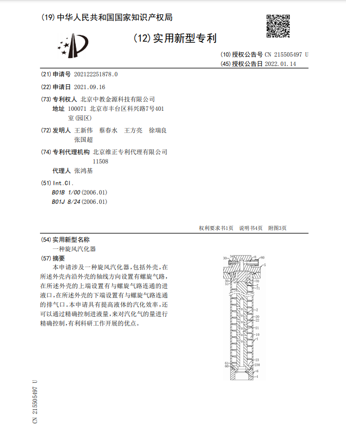 本申請涉及一種旋風汽化器,包括外殼(ké),在所述外殼內沿外殼的(de)軸線方向設置有螺旋氣路,在所述外殼的上端設置(zhì)有與螺旋氣路連通的進(jìn)液口,在所述外(wài)殼的下端設(shè)置有與螺旋氣路(lù)連通的排氣口。本申請具有(yǒu)提高液體的汽化效率,還可以通過精確控製進液量,來對汽化氣的量(liàng)進行精確控製,有利科研工(gōng)作開(kāi)展的優點。