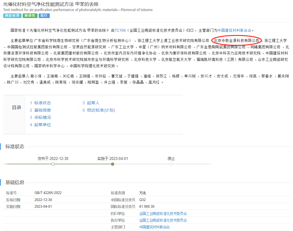 國家標準《光催化材料空氣淨化性能測試方法 甲苯的去除》 由TC194(全國工業陶瓷標準化(huà)技術委員會)歸(guī)口 ,主管部門為中國建築材料聯合(hé)會。