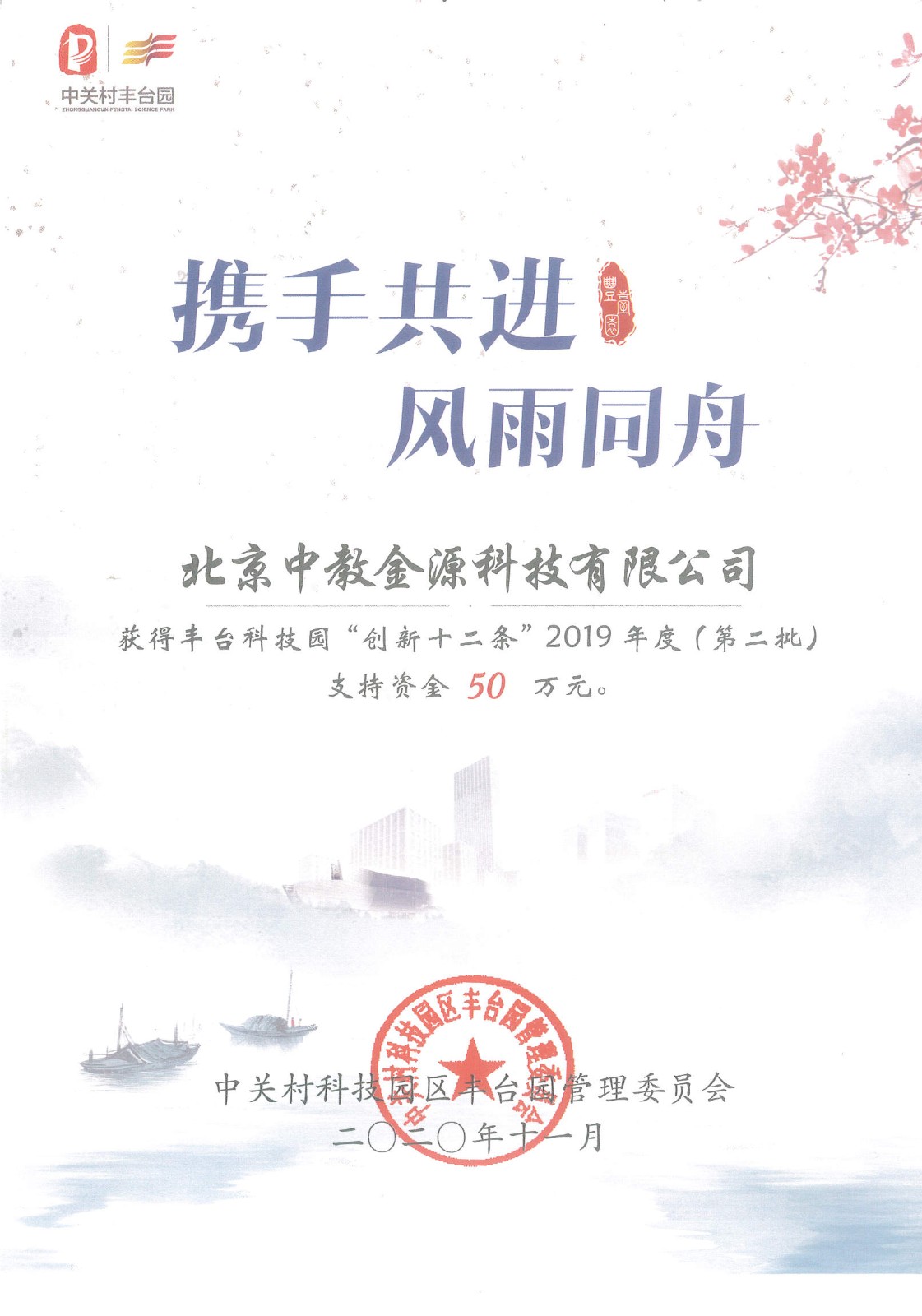 北京中(zhōng)教金源科技有限公司作為光催化領域具有創新的技術企(qǐ)業,榮獲(huò)豐台科技園區:“創新十二條”2019年(nián)度(第二批(pī))支持資金50萬元!