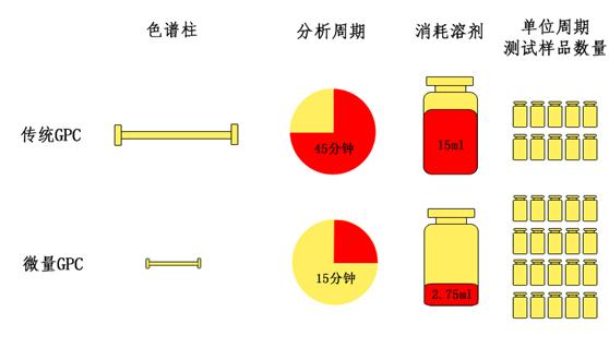 從(cóng)與常規凝(níng)膠滲透色譜儀的(de)對比中不難發(fā)現,mGPC在色譜柱、池體積等(děng)各個方麵(miàn)都已經微量化,並且使分析(xī)周期大大縮短,在單位周期內測試的樣品的數量是傳統儀器的兩倍,在一(yī)些寬分布樣品的測試中有著更好的表現。某(mǒu)些寬分布高分子樣品采用傳統方法測試需要多根(gēn)色譜柱(zhù)串聯,往(wǎng)往需要幾個(gè)小時測試,而采用mGPC與(yǔ)線性微量凝膠色譜柱測試,隻需要不到半個(gè)小時。