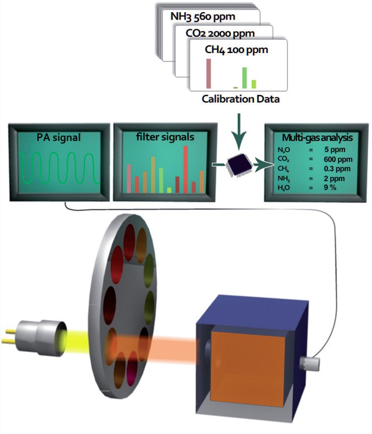 GASERA-F10多氣體(tǐ)分析儀基於紅外光聲光(guāng)譜技術,擁有脈衝紅外光源,通過窄帶光學濾波片(piàn),形成中紅外區10個光譜波段,用(yòng)於氣體分析(xī);超高靈敏度基於專利的(de)擁有增強懸臂梁光學麥克風技術,可通過10種光學窄帶濾波片實現,極窄的光學濾波可去除背景氣體的幹擾;多個光譜(pǔ)區域可有利於最小的交叉靈敏度(dù)。對采樣響應結果按照改進的經典最小二乘法進行數據校準。