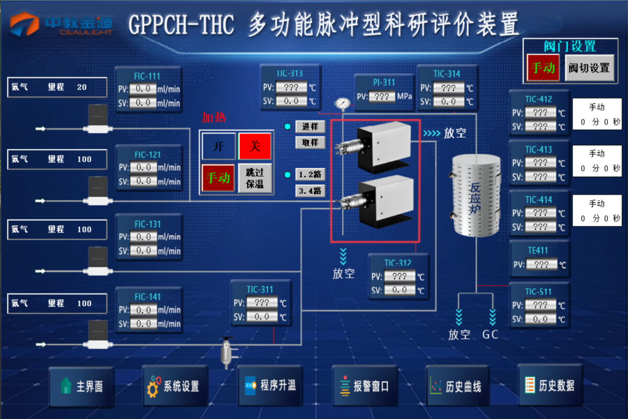 本裝置的自動控製集成在工控一體機上,包括壓力監測、報警(jǐng)界(jiè)限參數(shù)設置、氣體體積流量自動控製(zhì)、程(chéng)序升溫自動控製、六通閥(fá)及(jí)脈衝進料方式自動切換、數據(jù)實時(shí)監測和記錄等。在管路切換(huàn)和排放以及出設置手動閥門(mén)及安(ān)全閥,實現手動控製與自動控(kòng)製結合,保證裝(zhuāng)置合理性和可操(cāo)作性。