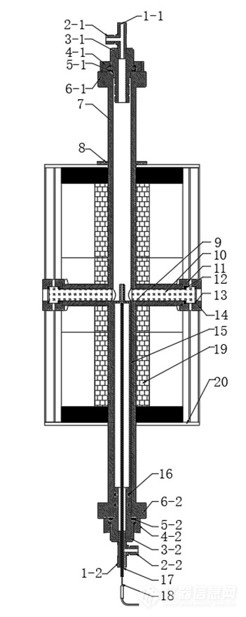 本發明(míng)涉及一(yī)種光催化管式反應器,其特征在於:包括金(jīn)屬外筒(tǒng)(7)和石英內筒(15),金屬外筒(7)與石英內筒(15)為分體結構,金屬外筒(7)套(tào)在(zài)石英內筒(15)外;金屬外筒(tǒng)(7)左右兩側設有導光筒(9),導光筒內裝有導光柱(10),光通過導光(guāng)柱(10)穿過石英內筒(15);金屬外筒(7)上下端分別設有上端口(kǒu)接頭(3-1)和下端口接頭(3-2);反應氣體和反應液體從上(shàng)端口接頭(3-1)進入反應器(qì)內,反應後從下端口接頭(tóu)(3-2)流出本發明提供的一種高溫高壓光(guāng)催化管式反應器石英為催化劑載體,左右雙向光照,高溫800℃下,長期使用壓力可(kě)達10MPa,突破了光催化管式反應器隻能做常壓實驗的限製,擴大了光催化領域的研究範圍。