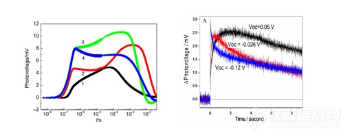 瞬態光電(diàn)壓研究光(guāng)生電子的(de)傳輸行為,其光電壓(yā)響應包(bāo)括上升和衰退兩部分,光電壓上升部分在物理上對應於TiO電極導電基底電子濃度增加(類似於電容充電過程),此過程(chéng)由光生電子擴散到(dào)達基(jī)底(dǐ)引起,光電(diàn)壓下(xià)降部分主要(yào)對應於電子離開導電基底的複合過程(類似於電容放電過程(chéng))。瞬態表麵光電(diàn)壓譜光生載(zǎi)流子動力學;瞬態光電壓(yā)研究光生電子的(de)傳輸行為。